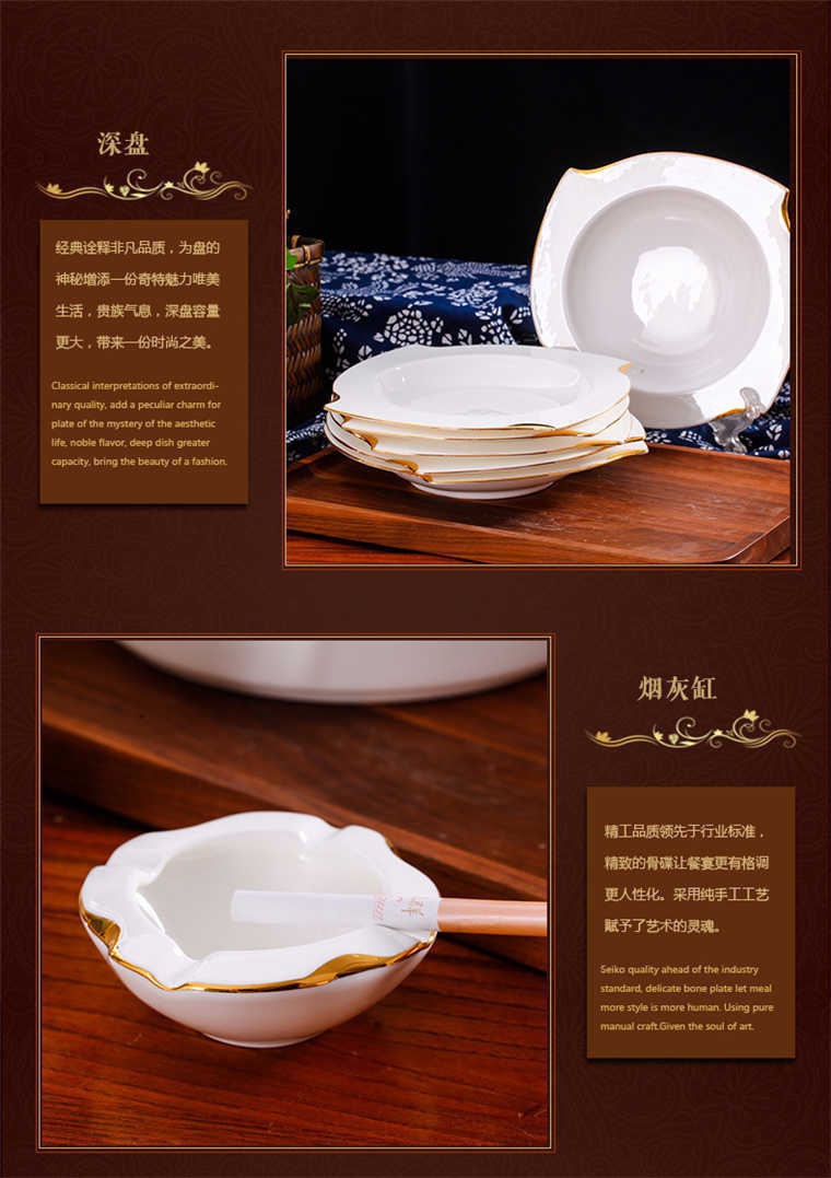 73頭旋方帶咖啡具,餐具一個(gè)湯煲,一個(gè)魚盤,一個(gè)十寸平盤,一個(gè)大湯勺,一個(gè)煙缸,一個(gè)牙簽筒,兩個(gè)面碗,十個(gè)八寸盤,十個(gè)4.5寸飯碗,十個(gè)味碟,十個(gè)調(diào)羹,十個(gè)筷子架??Х染咭粋€(gè)咖啡壺,一個(gè)糖缸,一個(gè)奶罐,六個(gè)杯子,六個(gè)碟子。
